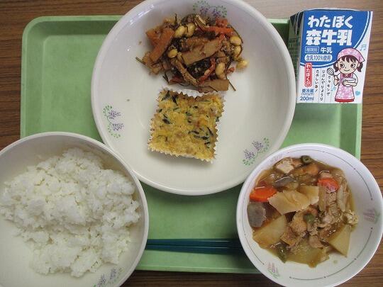 こぎつねごはん、牛乳、鶏肉の塩麴焼き、かんぴょうの和え物、のっぺい汁でした。