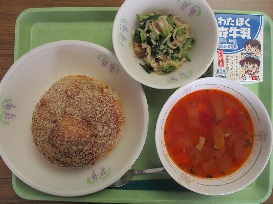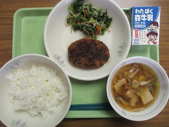 ごはん、牛乳、キャベツ入りメンチカツ、おひたし、田舎汁でした。