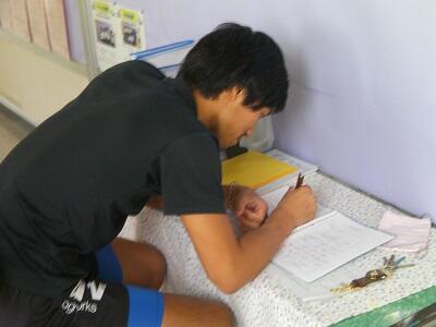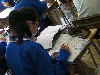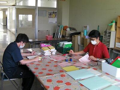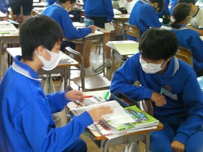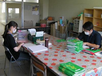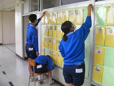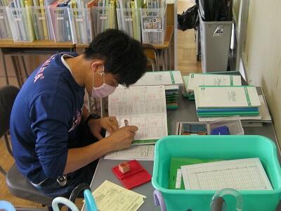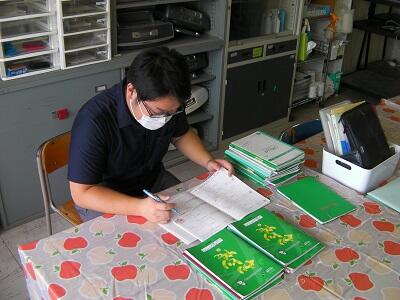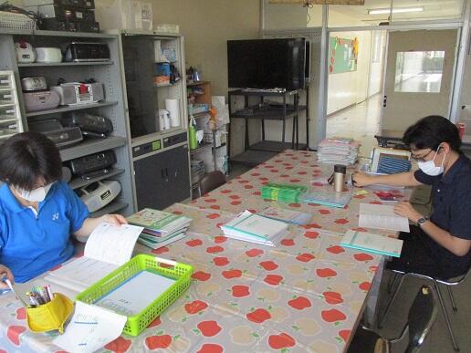 学年室で黄金サイクルノート、やりとり帳をみています。
