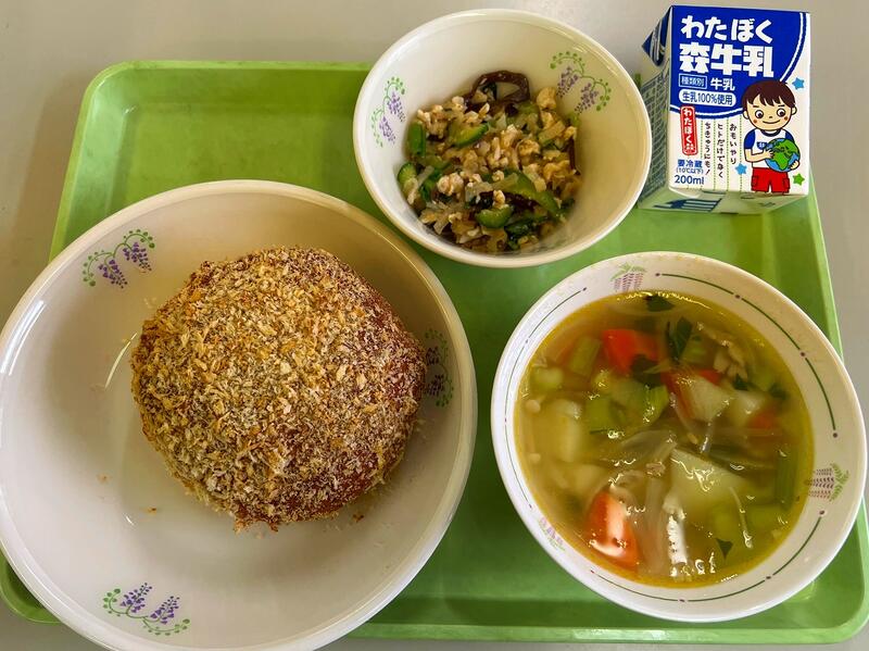 ごはん、牛乳、ゼリーフライ、おひたし、凍り豆腐の煮物でした。