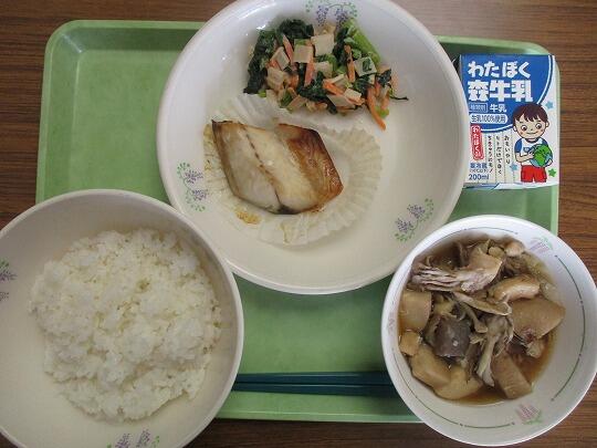 秋の香りごはん、牛乳、豚肉の生姜焼き、みそ和え、のっぺい汁でした。