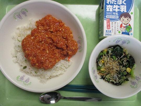 中華風ピリ辛ごはん、牛乳、いかのごまマヨネーズ焼き、華風和え、豆腐スープでした。