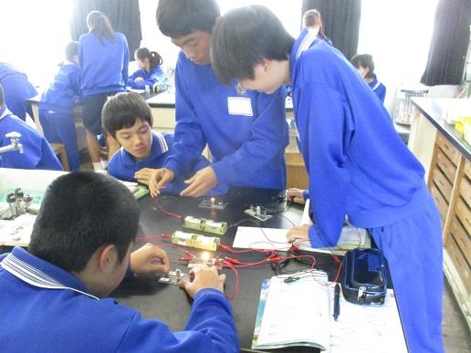 2年生理科です。直列つなぎと並列つなぎ、それぞれ電圧の違いについて実験しています。