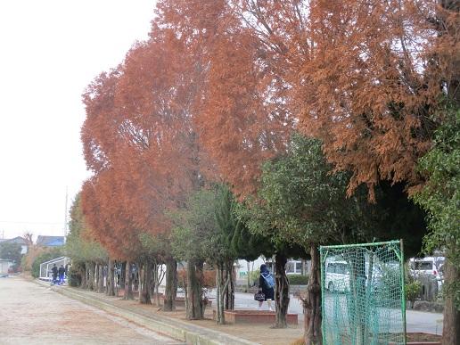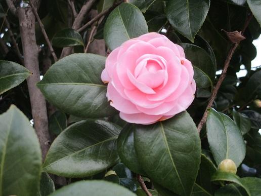 ソフトボール部のバックネット付近に椿があります。南側で花が咲いています。