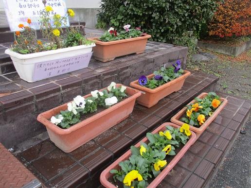 職員玄関前の階段です。用務員さんがパンジーを植えてくれました。