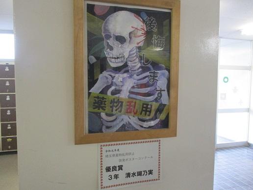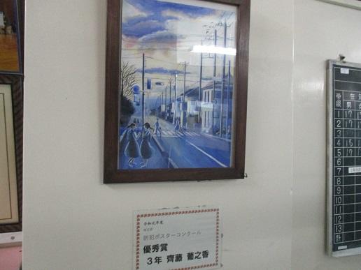 職員室前の廊下です。ポスターコンクールで表彰を受けた作品が、新たに掲示されています。