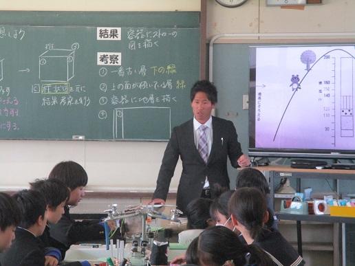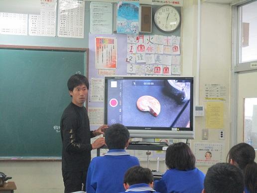 1年生理科です。「大地の変化」という単元を学習しています。先生がアンモナイトの化石を紹介しています。