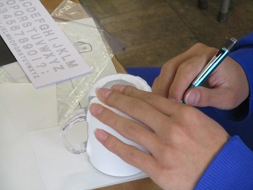 3年生美術です。3年生3学期の美術は「世界でたった一つのコップを作ろう!」として、サンドブラストという技法を使い、ガラスのコップに図柄を描いていきます。