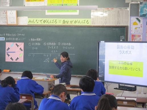 1年生数学です。「説明する力も磨いていこう!」を今日の目標として、平行移動、回転移動、対象移動という図形を移動させる考え方を学んでいます。
