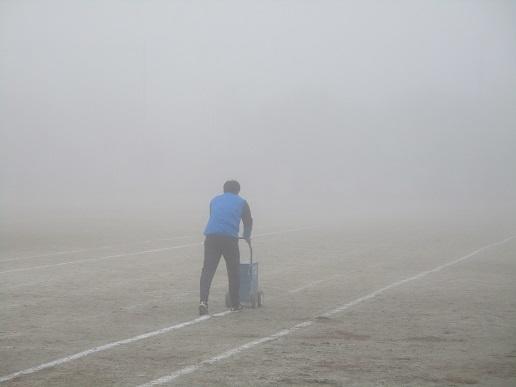 霧の中、保健体育の先生が校庭に白線を引いてくれています。