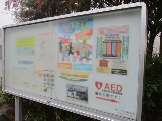 正門脇にある掲示板も、霧の湿気でガラスがくもっていました。