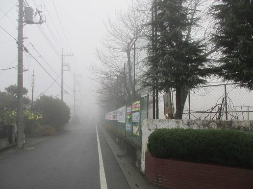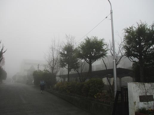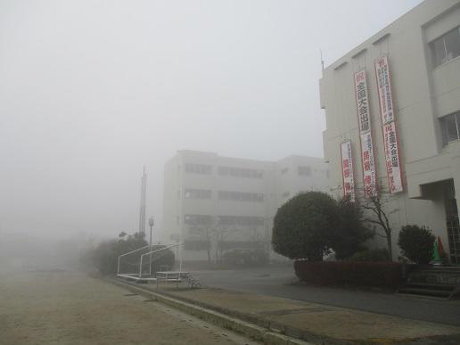 正門から体育館、校舎を見ると霧で見えづらかったです。