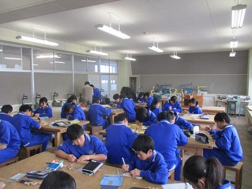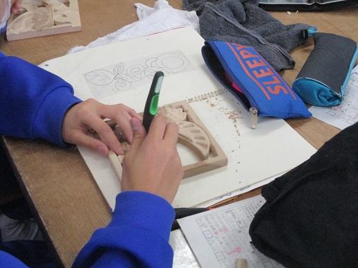 2年生美術です。『オリジナル欄間~伝統文化を感じて~』自分がデザインした形に板材を丁寧に彫っています。