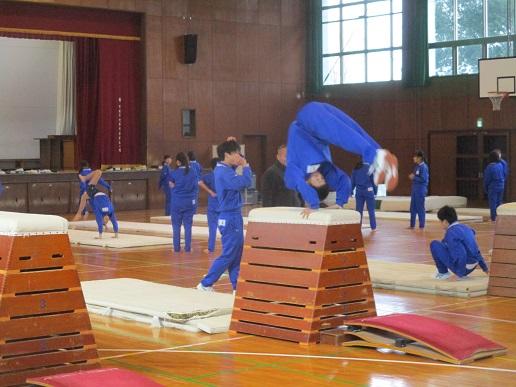 1年生保健体育、マット運動です。着手、姿勢、着地など、発表会での観点について先生が説明しています。