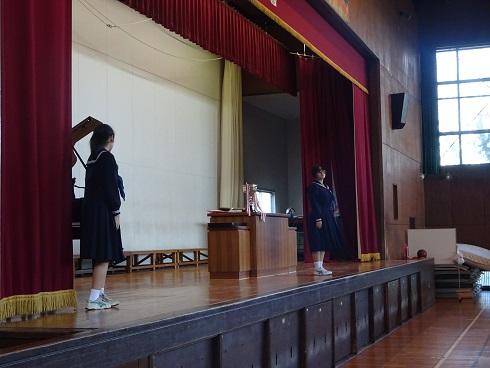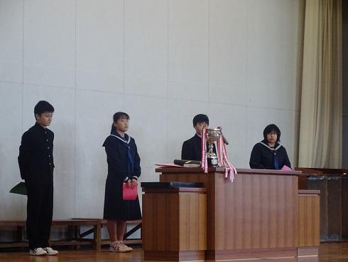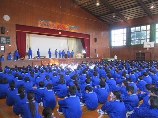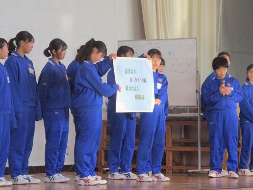 2月7日金曜日、今朝は生徒朝会を行いました。3年生を送る会実行委員から、今年のスローガン「広げよう ありがとうの輪 咲かせよう 感謝の花」が発表されました。