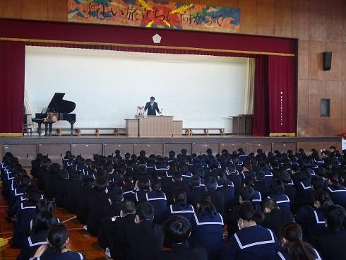 1月8日水曜日、今日は3学期始業式です。冒頭で各学年からの代表生徒が「新年の抱負」を発表しました。新しい年を迎えたこの節目に一人一人が目標を持ち、自分という個性を磨いてほしいと思っています。