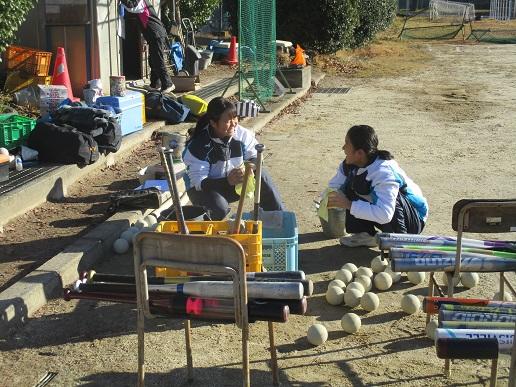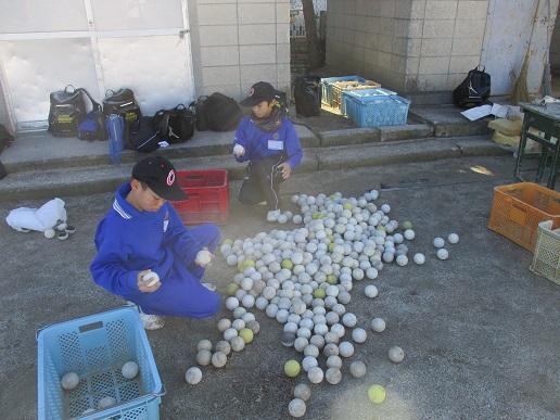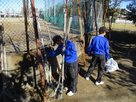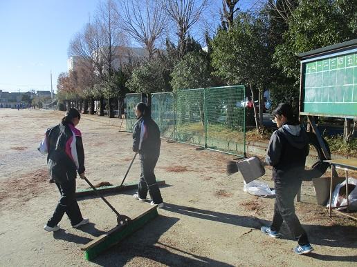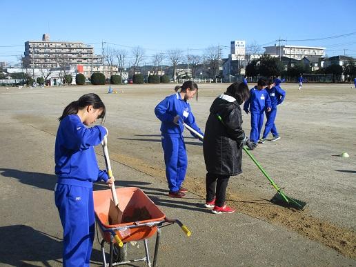 ソフトボール部です。用具を外に出し、大掃除とグラウンド整備をしています。
