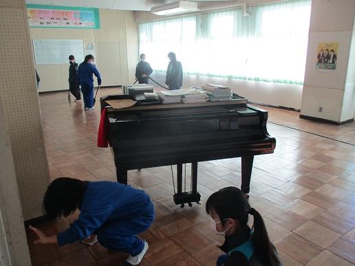 ウインドオーケストラ部です。音楽室の机やいすを廊下に出して、大掃除をしています。