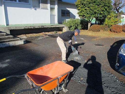 用務員さんです。駐車場に砂利をまいてくれています。用務員さんには学校の修繕や整備に、いつも細やかな配慮をしていただいています。ありがとうございます。