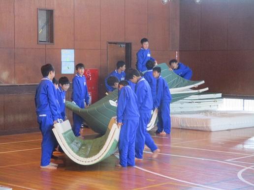 1年生保健体育です。授業が終わる頃の様子です。用具を片付けた後、先生が授業後の話をしています。マット運動では、前転、後転、開脚前転(後転)などの技に挑戦しています。