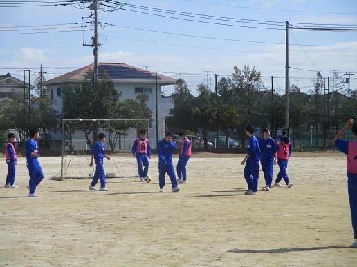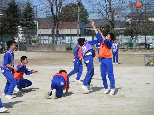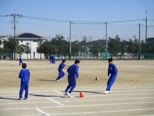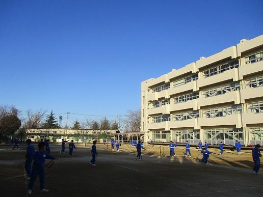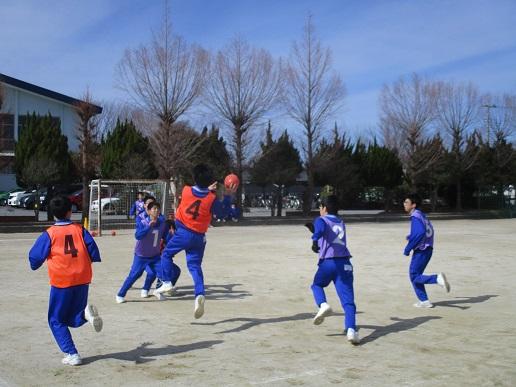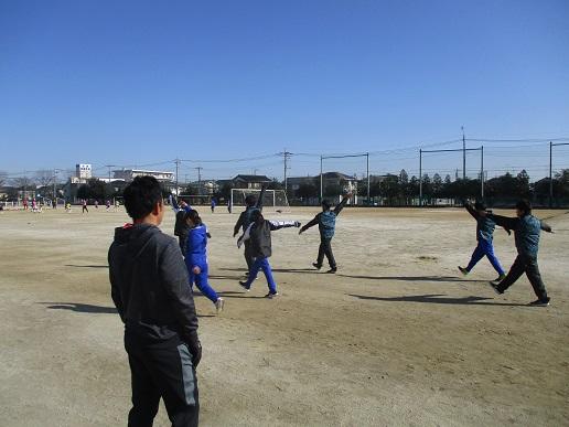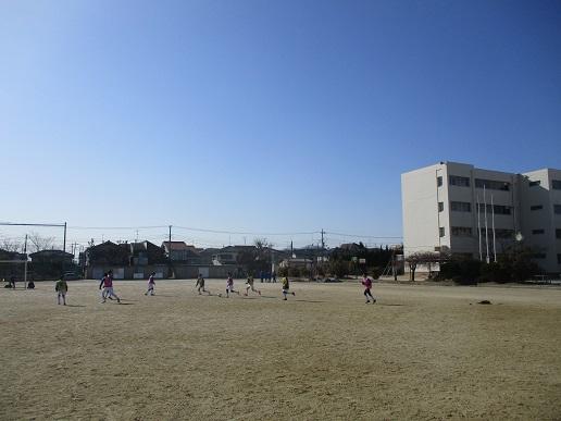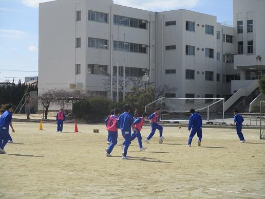 2月19日水曜日です。きれいな青空、心地よい微風を感じる日です。3時間目の校庭では、3年生が保健体育でサッカーとハンドボールを行っていました。