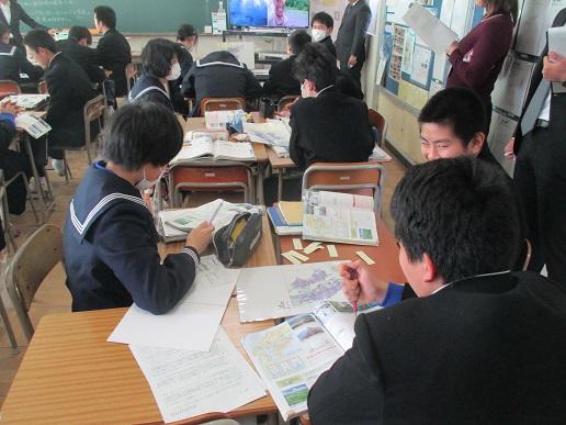 2年生社会です。3つの資料(地理・歴史・交通)を読み取り、自分の考えとしてまとめています。