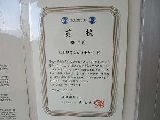 第33回毎日カップ「中学生体力つくりコンテスト」において、本校が努力賞として表彰されました。平成29年、30年、令和元年と3年連続の受賞です。写真にある賞状は、2階渡り廊下に掲示してあります。