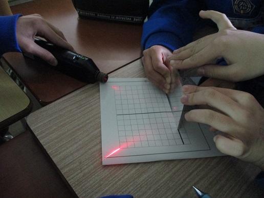 1年生理科です。「光はどのように進むか」入射角、反射角について学んでいます。