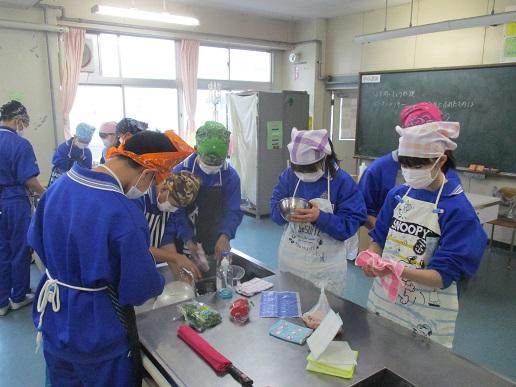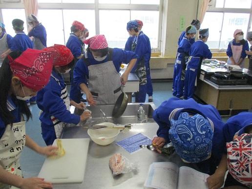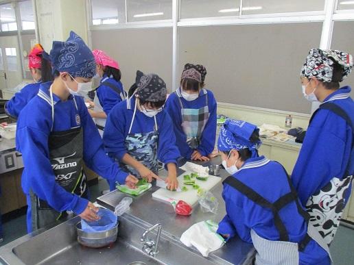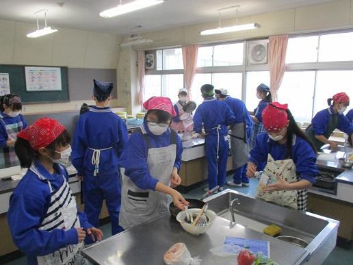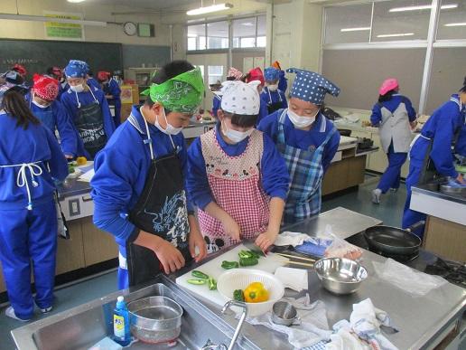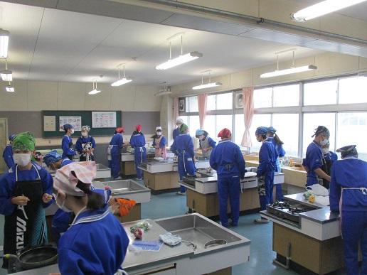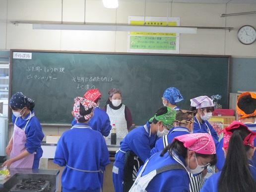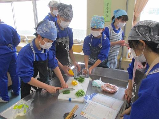 1年生家庭科です。今日は調理実習で「ぶたのしょうが焼き」「ピーマンのソテー」を作っています。「おろししょうがは焦げやすいので、強火で短時間で焼く」「油を使ったフライパンや食器の後片付けでは、古布で汚れを拭き取ってから洗うと、排水の汚れをおさえられる」実習前の準備をしっかりと行ってきた様子がうかがえます。