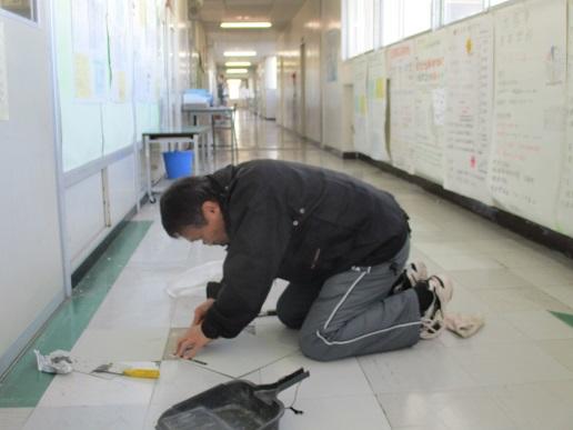 授業が行われている傍らで、用務員さんが廊下の補修をして下さっています。タイルが割れてしまった箇所を、きれいにしてくれる生徒もいるとのことです。いつもありがとうございます。