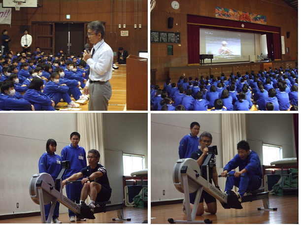 「想いを込めて、伝える!!仲間とともに気づき どもに学べ」という演題で、まずは、自身の早稲田大学ボート部時代や卒業後入社した日本航空、現在のマイオースポーツでの体験を交えて仕事で大切なことについて、特に「想い」と「感謝」についてお話いただきました。次に「夢」を実現させることの大切さについて、ボート競技のPV上映、ローイングマシーンの体験を交えて語っていただきました。最後に、「あきらめない心」の大切さを説き、80分の講演を締めくくりました。