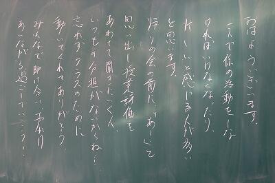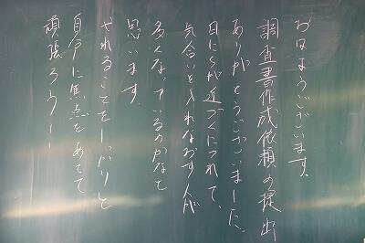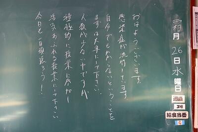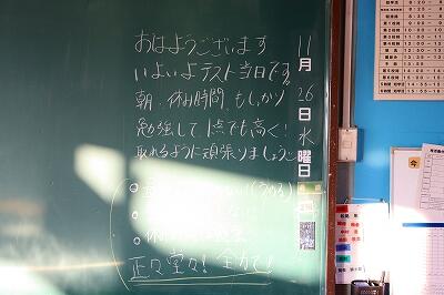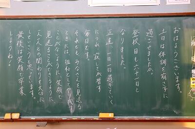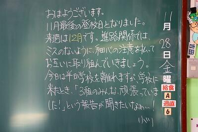 明日、明後日は進路検討会議が予定されています。これは3年生の生徒一人一人の現在の志望校やこれまでの成績などを3学年の先生方はもちろん、多くの先生方で確認し、以後適切な進路指導ができるように確認をする、時間のかかる大切な会議です。校長以下、全教職員の願いは、卒業生全員が来春、希望を胸に大沼中学校を巣立ってゆくことです。しかし、どうだろう…、3年生はいま全員が本当に精一杯のがんばりをしているだろうか…。これまでの3年間の学校生活を思い起こしてほしい。授業、部活動、学校行事とたくさんの経験をしてきたこと、そしてそれらは君たちが中学校を卒業後に力強く社会で生きていけるための力をつけることが目的だったはずです。辛くて厳しい、進路を切り拓くための努力が求められるこの期間も、仲間と共にがんばることができるように絆を深めてきたはずだ。しかし、進路のことから目を背け、仲間とたわいもない遊びをすることで時間を無駄に使い、進路活動から逃げている者がいる。懸命にがんばっている仲間や、心配し、応援してくださっている保護者や先生方への裏切り行為にも等しいと思いませんか…。しっかりしなさい。(校長)
