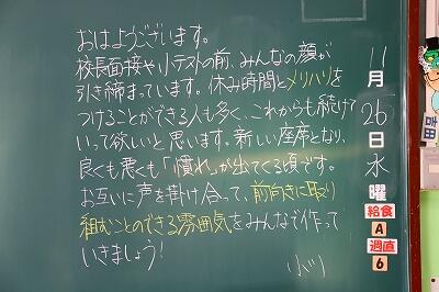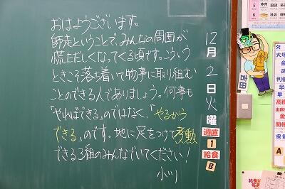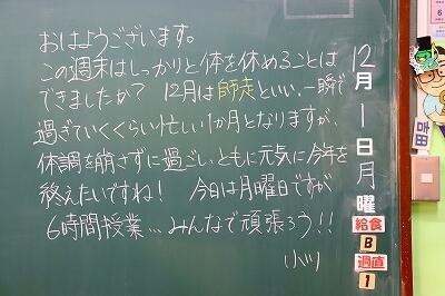 今日から12月です、いよいよ令和7年(2025年)の最後の月ですね。12月は昔の暦で師走(しわす)と言います。字を見てわかるとおり、師すなわちお坊さんや先生と呼ばれる人も走り回るほど忙しい月ということです。大沼中の生徒諸君にとって今年1年はどうでしたか…?早かったですか?それとも長かったですか?泣いても笑っても、今年もあとわずかです。校長先生も大変忙しい時期ですが、健康に気をつけて元気に乗り切りたいと思います。みなさんも健康に気をつけてがんばりましょう。