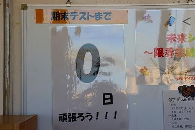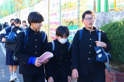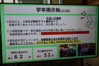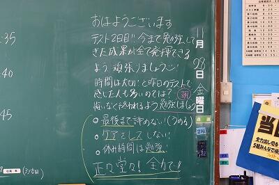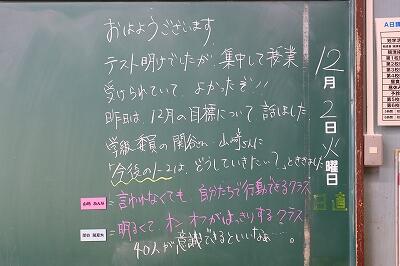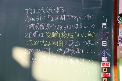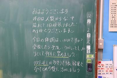 さて、1、2年生は期末試験が終わると、あとは冬休みが待ち遠しくなるだけです。冬休みは本当にアッという間に終わってしまいます。クリスマス、年末の大掃除、お正月、etc、気がつくと1月5日くらいになっていたりするものです。部活動もあることでしょう。家庭での生活、学習、部活動とよく計画を立てて、しっかり生活しないと、何もできずにあっという間に3学期を迎えてしまいます。家族とも相談しながら、早め早めに計画を立てましょう。特に学習の計画は大切です。1、2学期の復習をしたり、3学期に良いスタートを切るために、学習の計画をしっかりと立てたりと自分に厳しく着実に取り組んでいきましょう。また、3年生は卒業後の人生の第一歩を踏み出すための準備を全力でする冬休みとなりますね。受験は勝負ごとです。1点でも多く点数を取った者が勝ち。これまでの定期テストとは違い、やり直しをして力をつければいいというものではありません。まだまだ受験を甘く考えている3年生がいるようです。今日からでも遅くはありません、ピリッとしなさい。(校長)