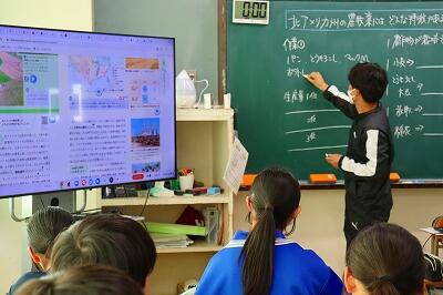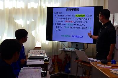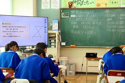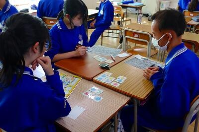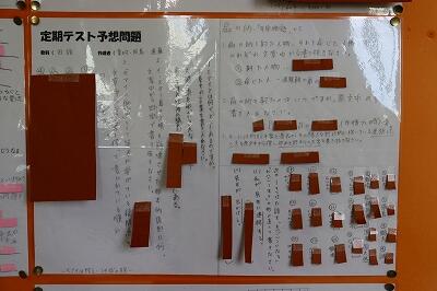 2年生の廊下には、予想問題が掲示されています。めくると模範解答が見られます。