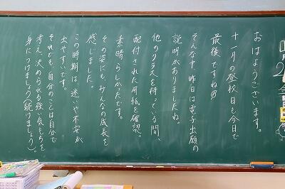 さて、みなさんの中で自分は勇気があると言える人はいますか…。「あるかなぁ」、「ないかなぁ」、「少しはあるかな」と考えますよね。では、勇気はどんな時に必要ですか…。困っている人を助ける時は勇気がいりますね。電車やバスで席を譲る時も慣れるまでは勇気がいるものです。また、友達が誰かに対して心無い行動をしているのを見たときはどうですか。「やめよう!」と言う勇気。いじめを知り自分の力で解決できない時にそれを誰かに伝える勇気。それはとても大切な勇気です。「やめて」と自分で言える勇気とともに、友達を大切に思う勇気を持ってほしいと思います。自分を、そして友達を大切に思う気持ちがあれば、勇気が生まれます。生徒諸君の誰にも勇気はあります。勇気があることに気づいていない、気づく機会がまだないだけかもしれません…校長先生はそう思っています。11月はいじめ撲滅強調月間、今日も元気出していきましょう!(校長)