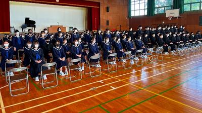 本日は、今年度最後の学校評議員会が行われました。授業参観では、3年生の卒業式練習の『巣立ちの決意』(答辞)をご覧になり、「コロナで制限されてしまった中学校生活の悔しさがとてもよく伝わりました。」と感動されていました。