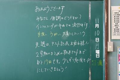 さて、今年は例年よりも早く、市内でインフルエンザの流行が始まっています。学級閉鎖になった小学校もあります。小学校に兄弟、姉妹がいる生徒も多いので、家庭内で移り、中学校にもすぐに蔓延します。すると塾などで感染が広がり、市内の中学校にも広がります。大沼中学校でも先週インフルエンザに罹患した生徒がいました。インフルエンザはコロナと同様、ウイルスが空気中に飛び散り、人に感染します。従って、マスクをしたり、うがい、手洗いを頻繁に行ったりすること。そして空気がよどんだ場所には近づかないようにしましょう。従って、教室の窓や入り口のドアを常に少し開けておくこと。休み時間には思い切って大きく開けましょう。過去にインフルエンザやコロナになったことのある人は、その辛さを思い出してください。自分の身は自分で守るようにして、今週も元気にがんばりましょう!(校長)