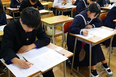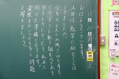 昨日、3年生は学力テストでしたね。もちろんテストは全力でがんばることが必要です。120%の力などは絶対に出せません。しかし、80%の力しか出せないことはよくあります。実力テストは、自分の今の力を知るとともに、自分が蓄え、持っている力を本番で100%出すための練習をしているという側面もあります。ただ、目先の点数や順位、偏差値に一喜一憂するよりも大切なこととして、これから先、1日1日を真剣に、そして大切に学校生活を過ごしていく中で、将来本当に役立つ学力や人間力を付けることが最も大切なことだということも付言しておきたい。(校長)