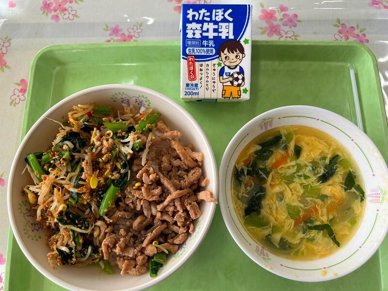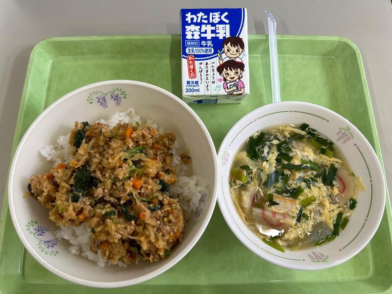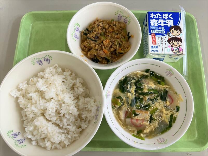 ピリ辛みそ丼(麦ごはん、具)、牛乳、かきたま汁でした。
