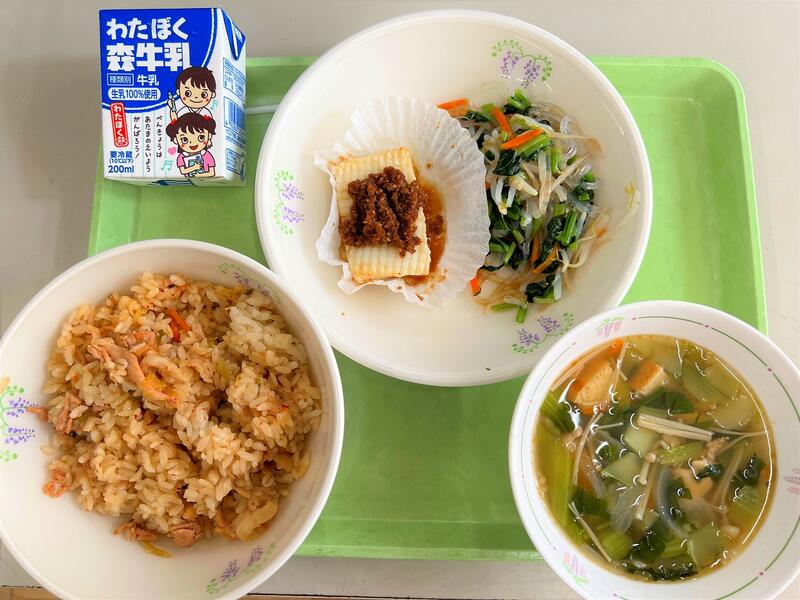 中華風炊き込みごはん、牛乳、鶏肉の黒酢揚げ、春雨サラダ、チンゲン菜のスープでした。