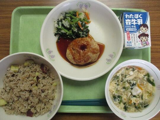 さつまいもごはん、牛乳、和風ハンバーグ、みそ和え、かきたま汁でした。