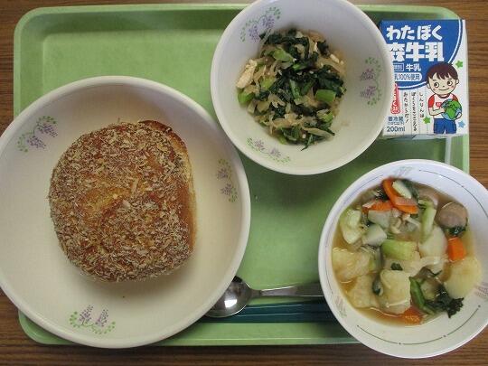煮ぼうとう風うどん(地粉うどん、汁)、牛乳、竹輪の二色揚げ、小松菜のソテー、みそポテトでした。