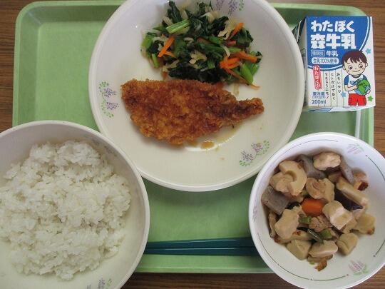 ごはん、牛乳、あじフライ、おひたし、磯煮でした。