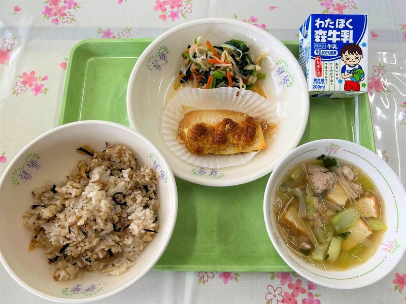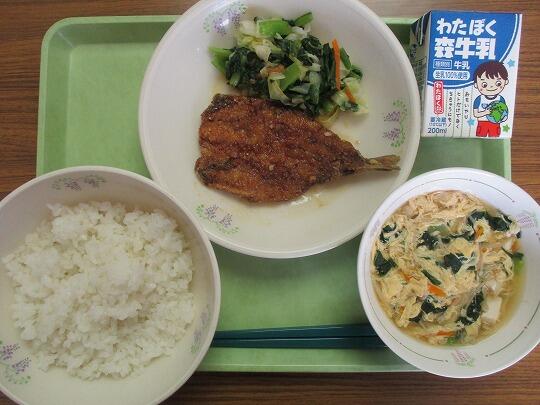 ごはん、牛乳、いわしのかば焼き、みそ和え、かきたま汁でした。