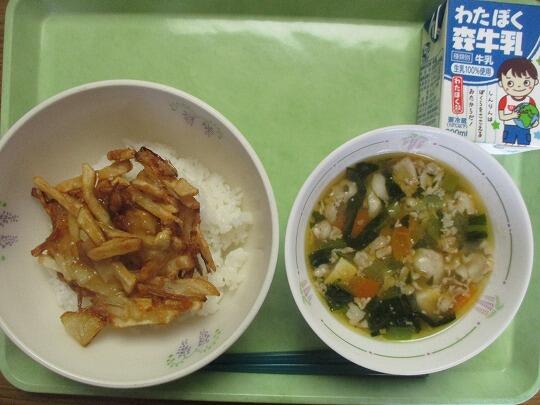 豚丼(麦ごはん、具)、牛乳、トックスープでした。