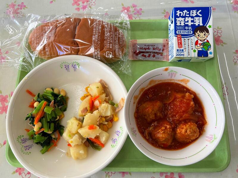 黒パン、メープルシロップ、牛乳、肉団子のトマト煮、ミックスポテト、ビーンズサラダでした。