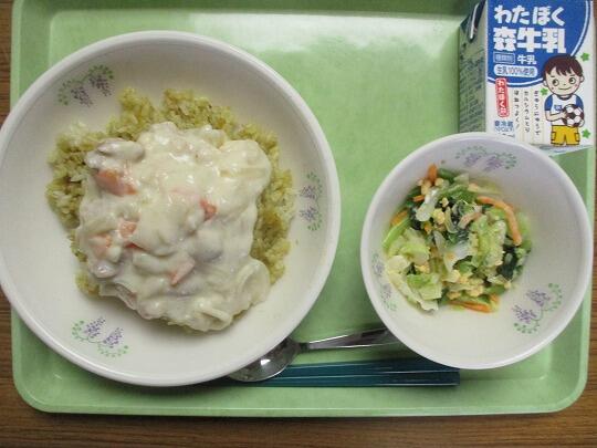 カレーピラフホワイトソースかけ、牛乳、ミモザサラダでした。
