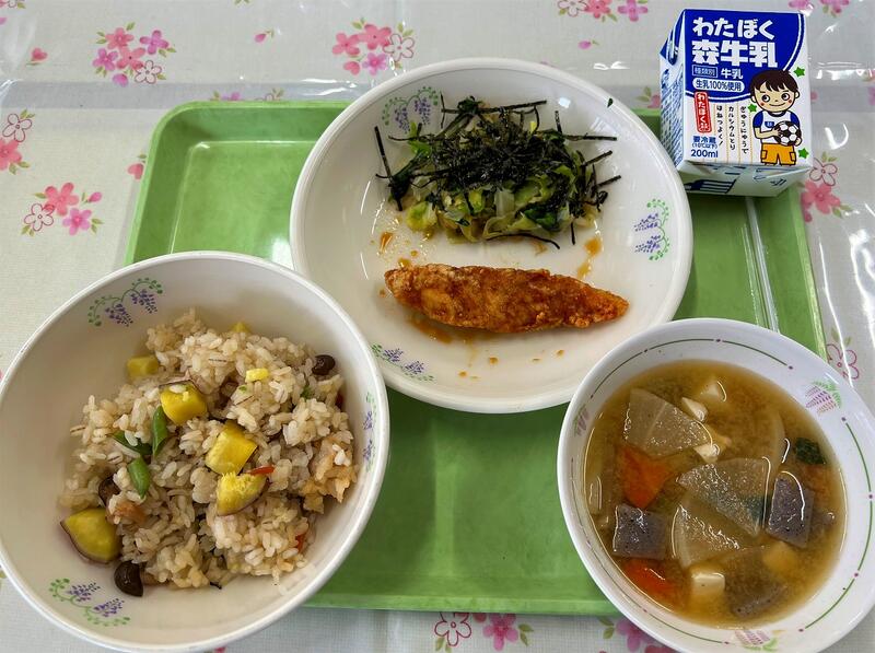 秋の香りごはん、牛乳、ささみのレモン煮、磯香和え、みそけんちん汁でした。