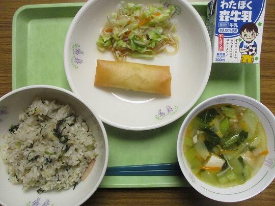 小松菜チャーハン、牛乳、変わり春巻き、中華サラダ、チンゲン菜のスープでした。